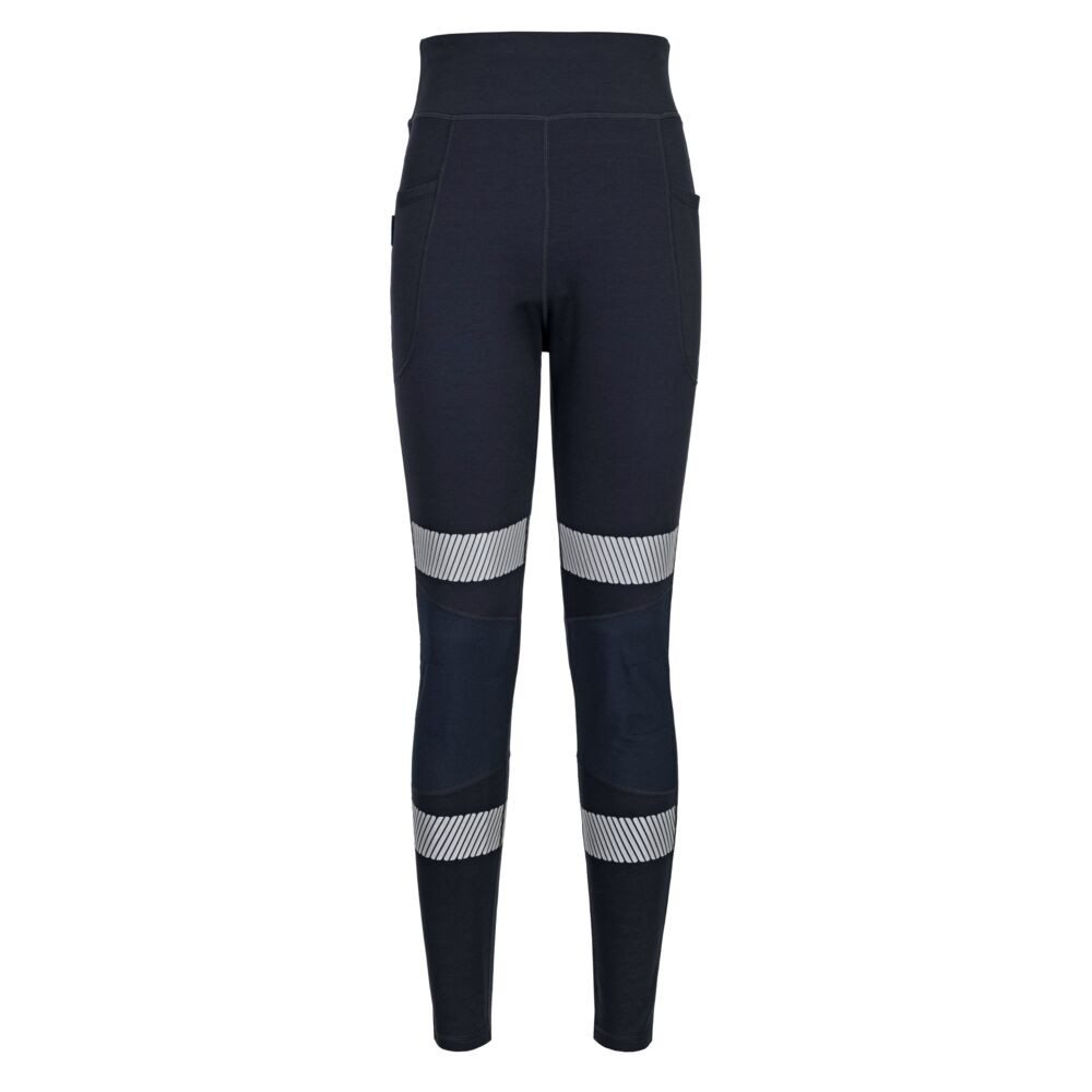 4 irányban nyúló anyaggal, hőillesztett, szegmentált fényvisszaverő szalaggal, magas derékkal és 2 zsebbel rendelkező női leggings, amelyet hevederrel való használatra terveztek.
