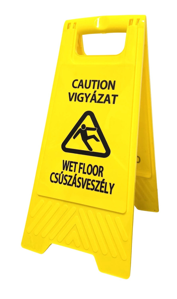 Csúszásveszély figyelmeztető tábla mindkét oldalán magyar és angol nyelvű feliratozással és nedves padló szimbólummal.