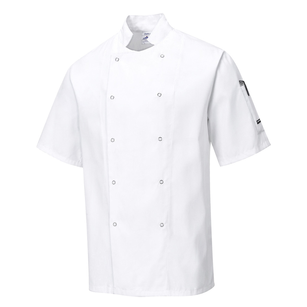 Nagy teljesítményt és kiváló viselkedési komfortot biztosító, minden igényt kielégítő, modern séfkabát modell, többfunkciós, stílusos unisex fazonban, 65% poliészter és 35% pamut összetételű alapanyagból. Strapabíró, kopásálló, tartós, színtartó, könnyű alapanyaga a mosási ciklusok után is megtartja méretét. Ez a munkaruha modell patent gombos elülső résszel, mandarin gallérral és tolltartó zsebbel készül.