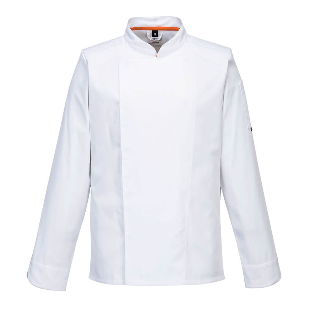 Ez a sztreccs séfkabát könnyű anyagból készült, és modern, karcsúbb sziluettet kínál ergonomikus illeszkedéssel. A dzseki jellemzői közé tartozik a kétmellű, rejtett patentos elülső záródás, a kötényfül a nyak hátsó részén, valamint a nagyméretű MeshAir Pro szellőző háló a háton és a hónaljban a kiváló légáteresztő képesség érdekében. MeshAir™ szellőző háló a hónalajnál, amely növeli a légáramlást Tartós poliészter/pamut szövet, mely nagy teljesítményt és maximális viselési komfortot biztosít Rejtett patentos elülső rész a könnyű hozzáférésért Slim fit design a kivételes komfortért A külső akasztófül biztosítja a kötény biztonságos elhelyezését 1 zseb a biztonságos tárolás érdekében Prémium folttaszító bevonat, mely taszítja az olajat, a vizet és a szennyeződéseket. Új modell